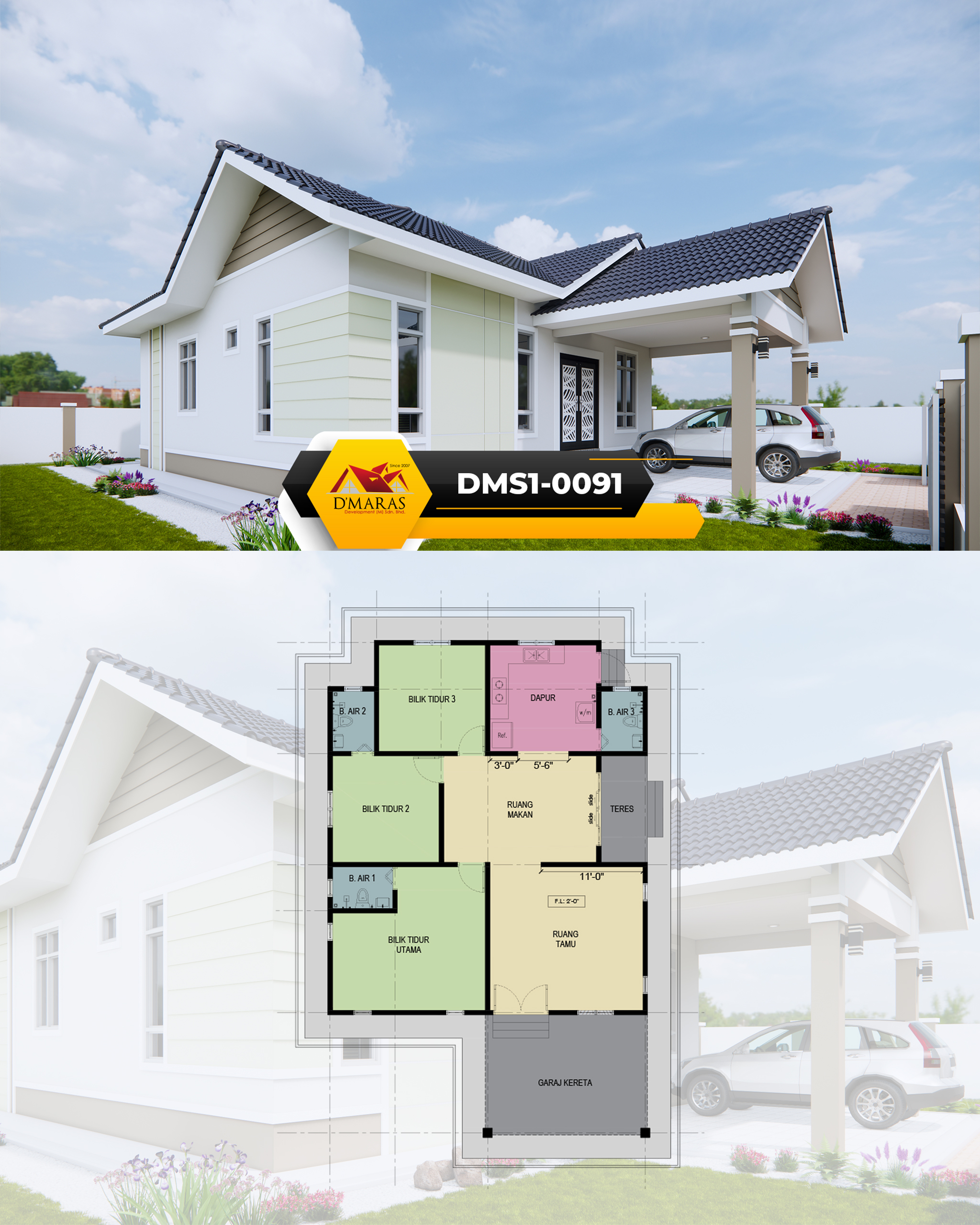 Saiz pelan ini berdasarkan pelan yang sedia ada. Pihak kami tidak menetapkan sebarang jaminan bahawa pelan ini sesuai dengan bentuk atau keluasan tanah di tapak tanah lain. Kami juga tidak bertanggungjawab sekiranya pelan ini tidak mendapat kelulusan Pihak Berkuasa Tempatan (PBT) / Majlis Perbandaran di kawasan masing-masing.
